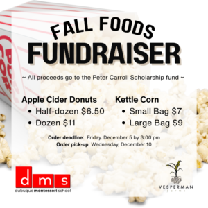 A special opportunity to order delicious fall season treats: apple cider donuts and kettle corn! All proceeds benefit the Peter Carroll Scholarship Fund, which provides financial aid to DMS students.
